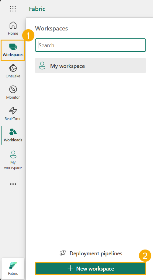 Now let’s create a workspace with a Fabric license. Select Workspaces(1) from the left navigation bar. A dialog opens.