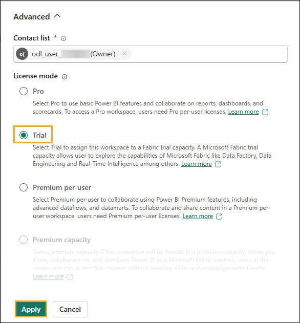 Select Apply to create a new workspace.A new workspace has been created, and you will be able to navigate into this workspace. We will bring data from the different data sources into a Lakehouse and use the data from the Lakehouse to build our model and report on it. The first step is to create a Lakehouse.