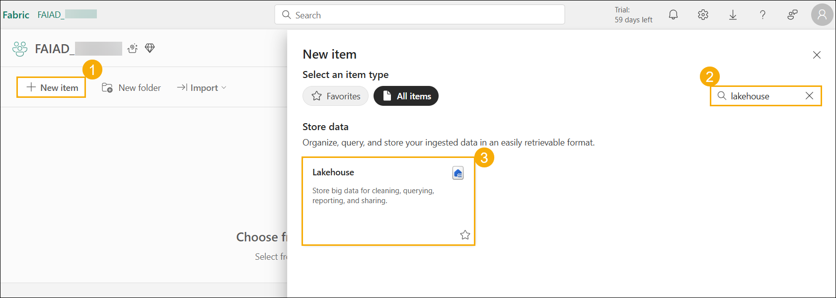 In the newly created workspace FAIAD_1837968, locate the + New item (1) button on the left-hand navigation pane. This is where you can begin creating new items in your workspace.