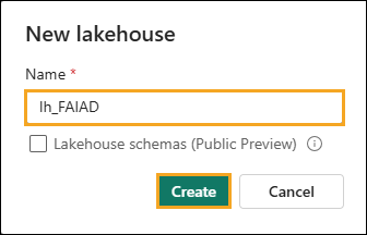 A new lakehouse dialog will appear. Enter lh_FAIAD in the Name textbox.Note: lh here refers to Lakehouse. We are prefixing lh so that it is easy to identify and search.Note: The preview feature of Lakehouse Schemas is very interesting, so it is something you should be aware of. Since it is in Preview state, we will ignore it so there is no negative impact on the lab experience. Once the feature is generally available, we will bring it into this lab.