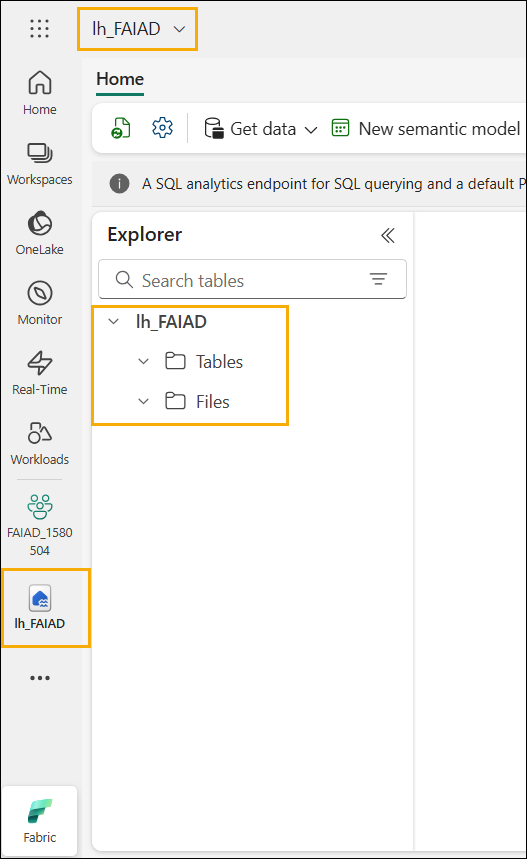 Select Create.Within a few moments, a Lakehouse is created, and you will be navigated to the Lakehouse interface. On the left panel, notice that below your workspace, you will have the Lakehouse icon. You can easily navigate to the Lakehouse by clicking on this icon at any time.Within the Lakehouse Explorer, you will notice Tables and Files. Lakehouse could expose Azure Data Lake Storage Gen2 files under the files section, or a dataflow could load data to Lakehouse tables. There are various options available. We are going to show you some of the options in the following labs.